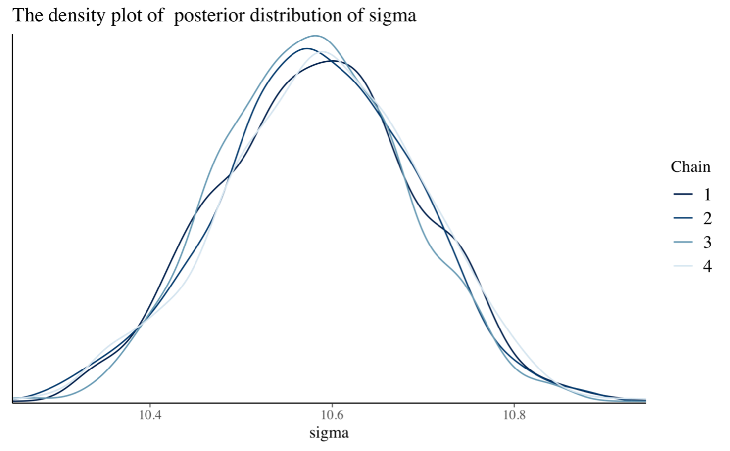 In this second graph, we are looking for the shape of the distribution of the $\sigma$ parameter, so we use a density plot. Furthemore, we see the distribution for each increasing number of chains in order to see how it changes.