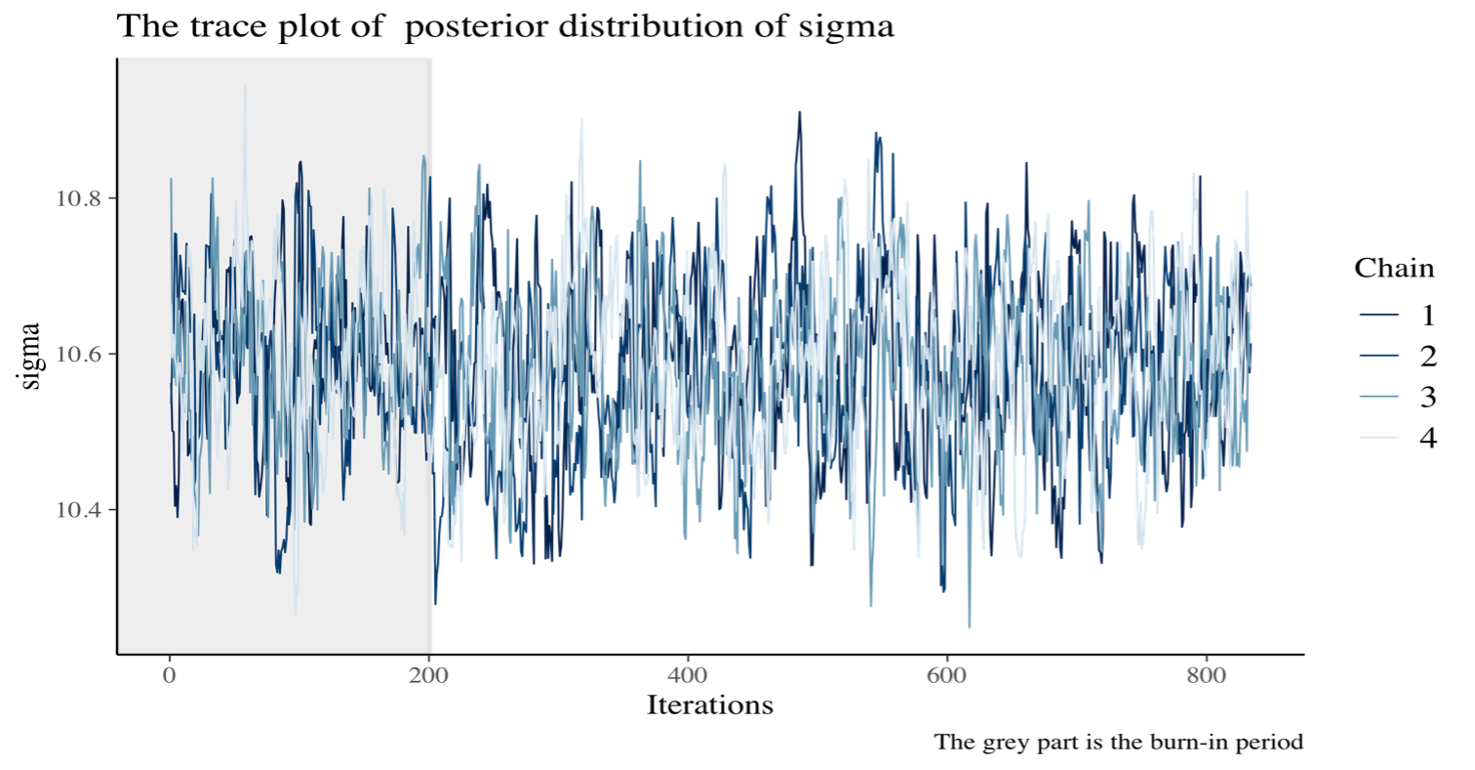 The MCMC requires to specify a lot of parameters , such as: * **Burn-In period**: The preliminary steps, during which the chain moves from its unrepresentative initial value to the modal region of the posterior. * **Chains**: MCMC sampling, values are drawn from a probability distribution, so these values forms the chain. So, in order to to evaluate the convergence of MCMC chains it is helpful to create multiple chains that have different starting values. * **Thinning**: The parameter thin allows the user to specify if, and how much, the MCMC chains should be thinned out before storing them, in order to decrease the autocorrelations.The graph here, illustrates one of the main graphical tools used to see if the MCMC has converged, ”the trace plot”. We adopt it in order to see if there is stability in the long run behaviour of this chain. In this particular case we want to see if there is a good approximation of the true posterior distribution of parameter $\sigma$.